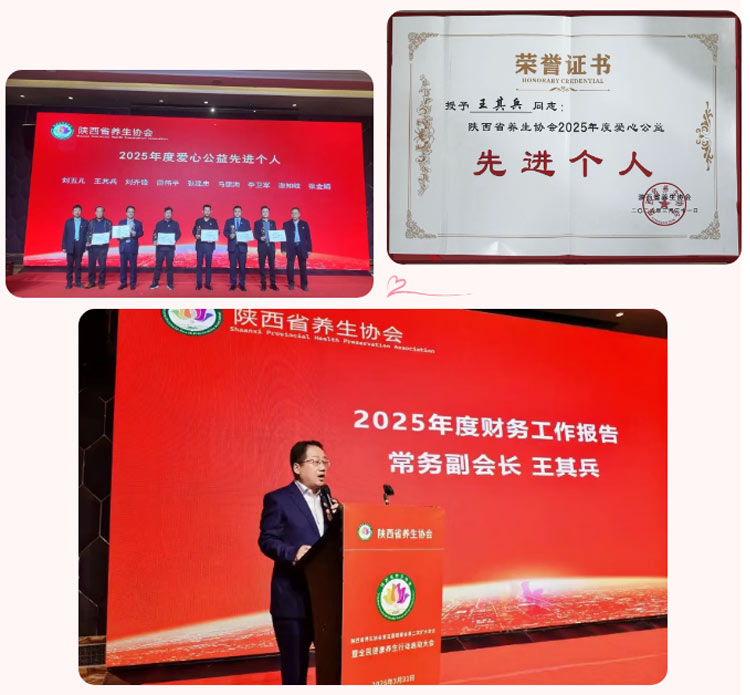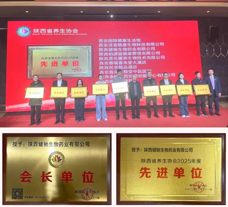 春风送暖,阳光和煦,3月31日,陕西省养生协会第五届理事会第二次扩大会议暨全民健康养生行动启动大会隆重召开。大会期间,陕西健驰生物药业有限公司(简称“健驰科技”)凭借2025年度在协会工作、行业发展、爱心公益等方面的突出贡献荣获“陕西省养生协会会长单位”“陕西省养生协会2025年度先进单位”两项殊荣,健驰科技董事长、养生协会常务副会长王其兵荣获“陕西省养生协会2025年度爱心公益先进个人”称号。
